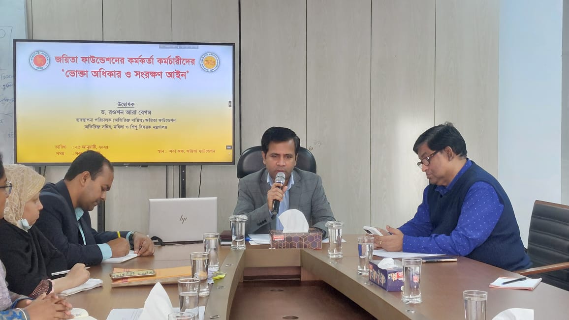 গত ২৩/০১/২০২৫ তারিখে জয়িতা ফাউন্ডেশনের কর্মকর্তা কর্মচারীদের ভোক্তা অধিকার ও সংরক্ষণ আইন সংক্রান্ত প্রশিক্ষণ অনুষ্ঠিত হয়। উক্ত প্রশিক্ষণে উদ্বোধক হিসেবে উপস্থিত ছিলেন জয়িতা ফাউন্ডেশনের ব্যবস্থাপনা পরিচালক ও বাংলাদেশ সরকারের অতিরিক্ত সচিব ড. রওশন আরা বেগম। এবং প্রশিক্ষণে মূল প্রবন্ধ উপস্থাপক হিসেবে উপস্থিত ছিলেন জাতীয় ভোক্তা-অধিকার সংরক্ষণ অধিদপ্তরের অভিযোগ ও তদন্ত বিভাগের পরিচালক (উপসচিব) জনাব মোহাম্মদ আজিজুল ইসলাম।