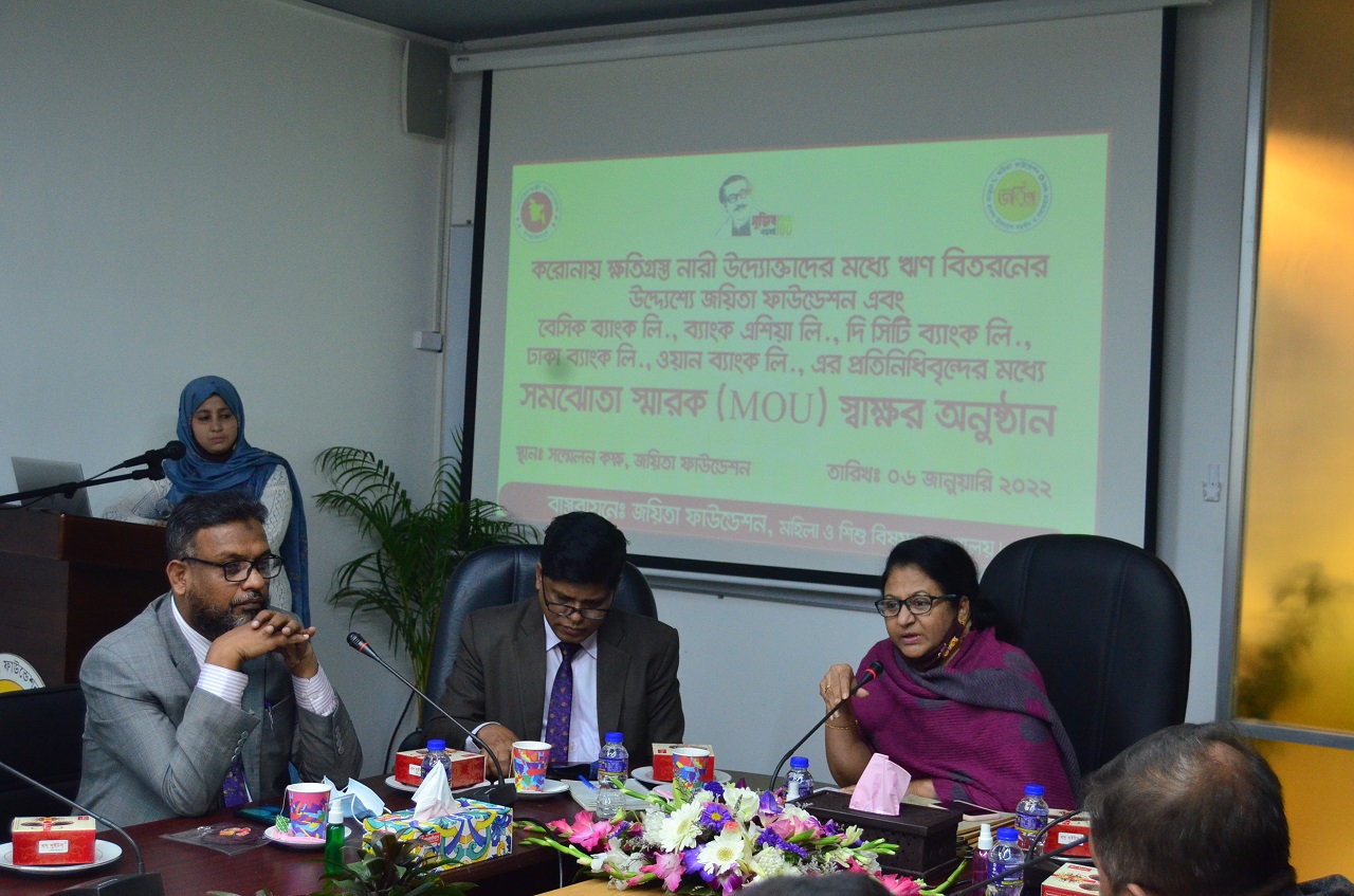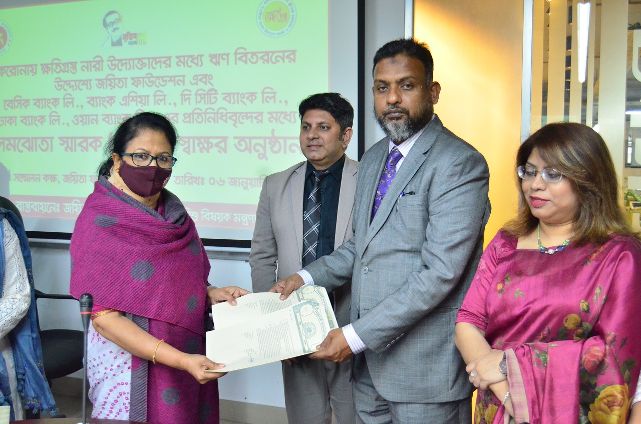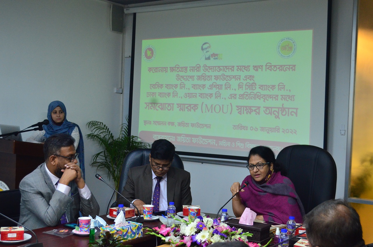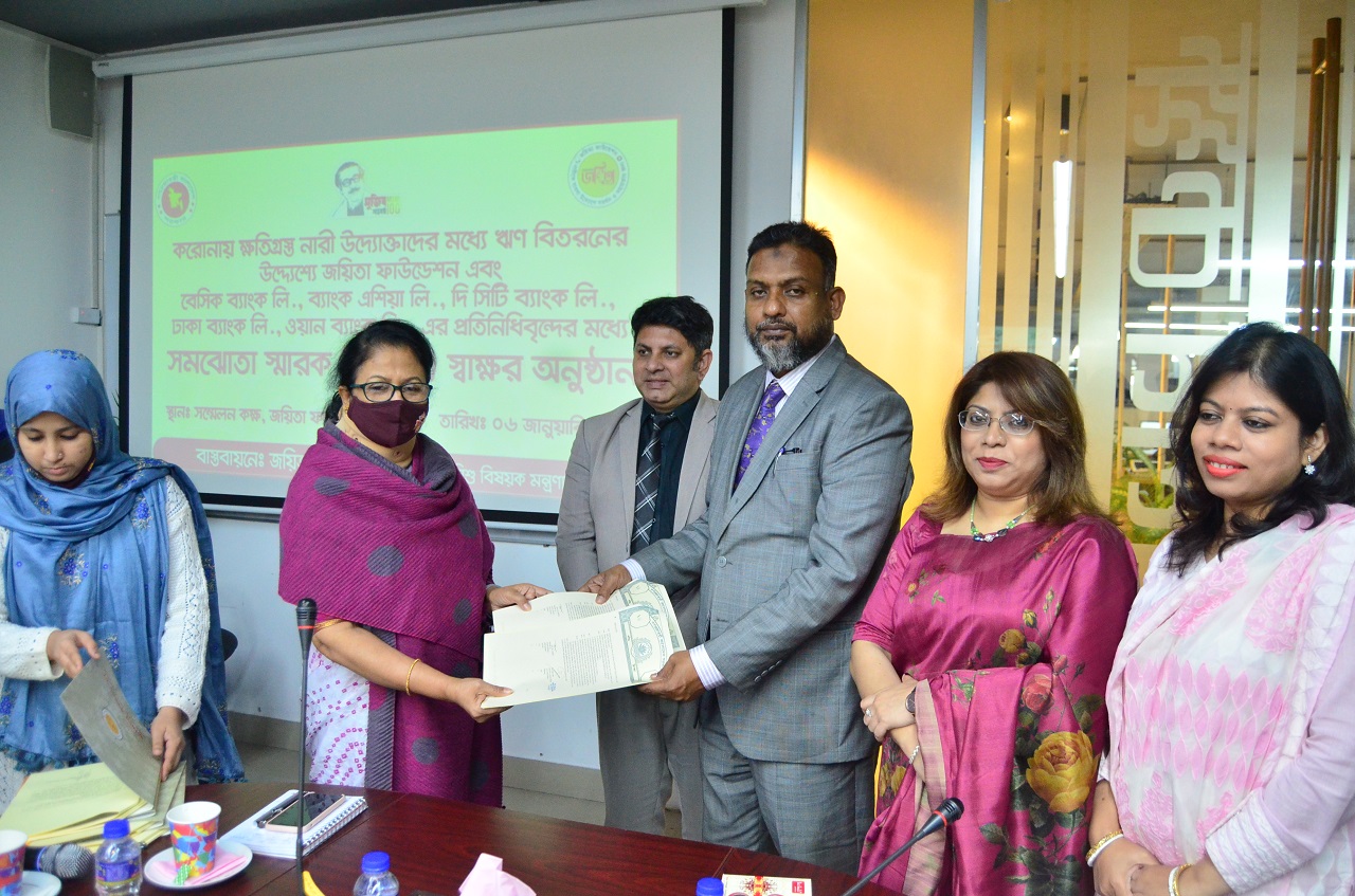 করোনায় ক্ষতিগ্রস্ত নারী উদ্যোক্তাদের মধ্য ঋণ বিতরণের উদ্দেশ্য জয়িতা ফাউন্ডেশন এবং বেসিক ব্যাংক লিঃ, ব্যাংক এশিয়া লিঃ, সিটি ব্যাংক লিঃ, ঢাকা ব্যাংক লিঃ, এবং ওয়ান ব্যাংক লিমিটেডের প্রতিদিন প্রতিনিধিবৃন্দের মধ্যে সমঝোতা স্মারক MOU স্বাক্ষর অনুষ্ঠান
