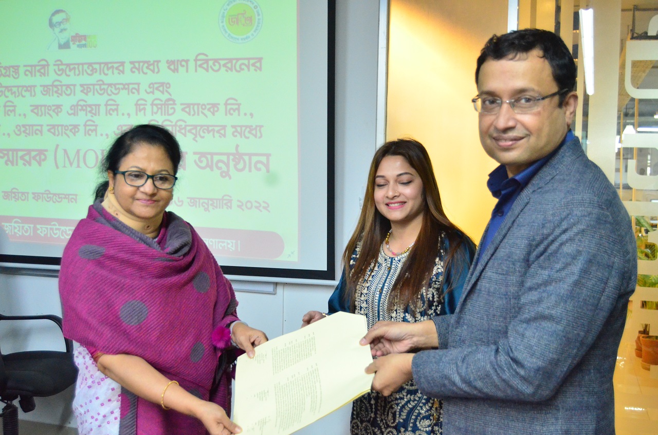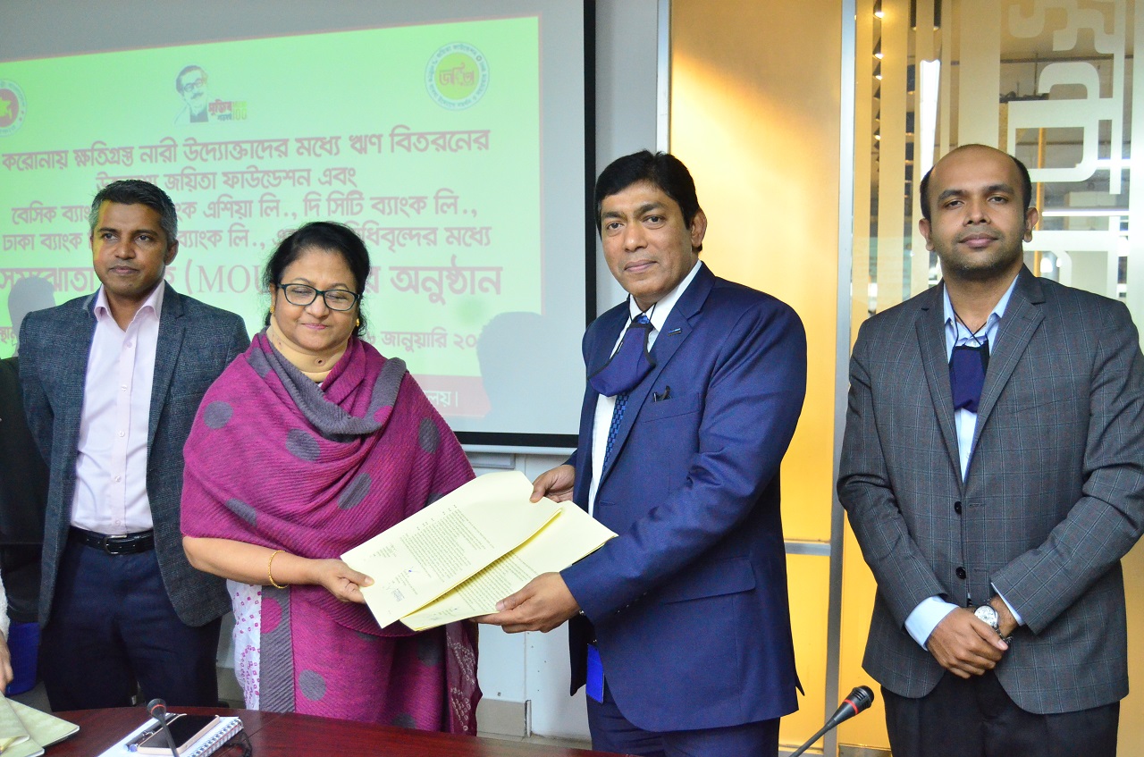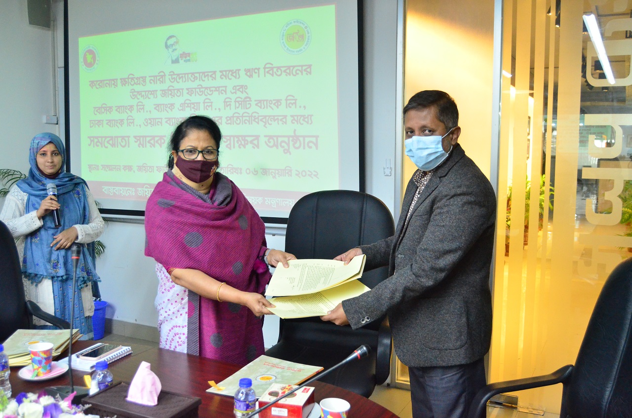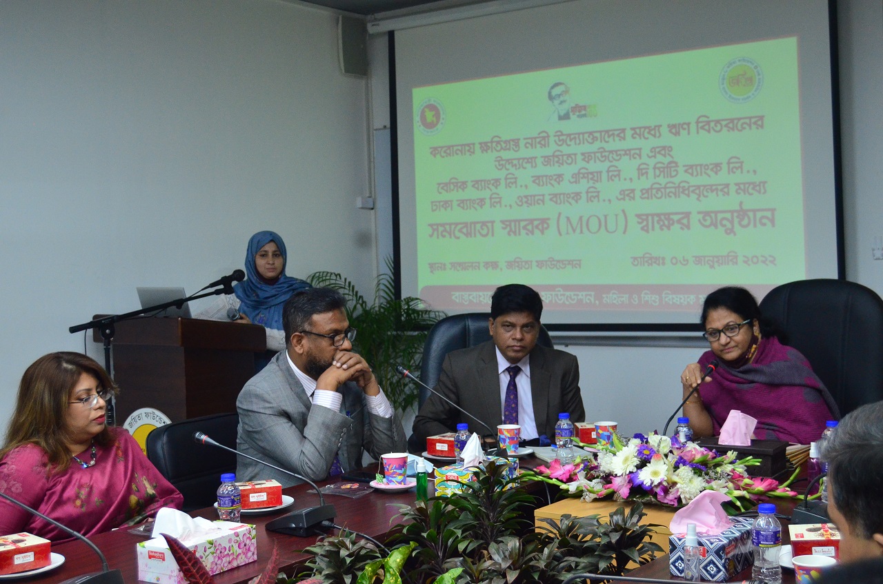 করোনায় ক্ষতিগ্রস্ত নারী উদ্যোক্তাদের মধ্য ঋণ বিতরণের উদ্দেশ্য জয়িতা ফাউন্ডেশন এবং বেসিক ব্যাংক লিঃ, ব্যাংক এশিয়া লিঃ, সিটি ব্যাংক লিঃ, ঢাকা ব্যাংক লিঃ, এবং ওয়ান ব্যাংক লিমিটেডের প্রতিদিন প্রতিনিধিবৃন্দের মধ্যে সমঝোতা স্মারক MOU স্বাক্ষর অনুষ্ঠান